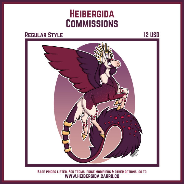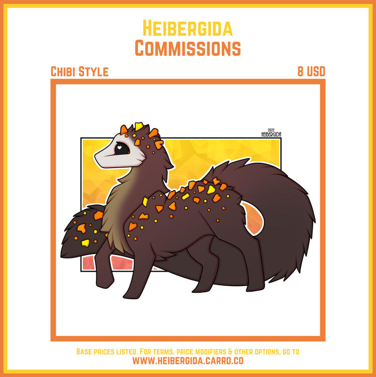 BEFORE WE BEGINPlease note that by commissioning me, you agree to the terms listed on this site.What I draw:Yes: Horses, dogs, cats, deer, dinosaurs, dragons, humanoids, anthro furries.No: Mecha/ robots, heavy goreMaybe: Anything else. Send me a message, and let's talk!SEND ME A MESSAGESend me a message on or Discord, where you let me know which of the above options you'd like for your piece.Please always include reference pics of the character.I will then send you my proposed price.THE PROCESSCommissions are paid 100 % in advance. Payment happens via Paypal.I will show you progress pictures along the way as I go. I’ll make sure to get your approval of the sketch and lines before I move on.After the sketch has been approved, smaller adjustments can be made at your request for no additional fee. Larger changes may require a small fee.My usual turnover time is about a week, but please allow for up to a month. If you'd like a certain deadline, let me know.OTHER RULESPlease share the commission with proper credit to me.I will post the drawing on my own platforms/ social media unless you ask otherwise.THAT’S ALLThank you for reading this. I look forward to working with you!Heibergida